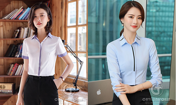 Thích hợp trong mọi hoàn cảnh thể hiện rõ sự trang trọng, lịch sự và duyên dáng, ngoài ra kiểu áo này rất phù hợp để kết hợp với đồng phục vest nữ.