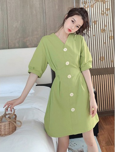 Một chiếc đầm cổ V màu rêu mang đậm phong cách Hàn Quốc.