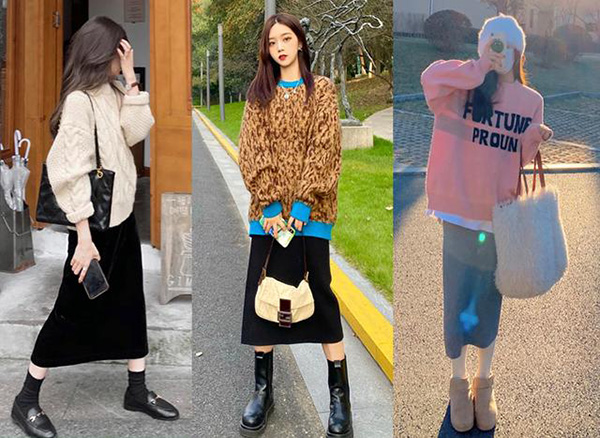 Ngọt ngào và dễ thương khi kết hợp áo len với chân váy suông dài và boot.
